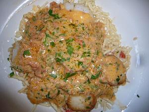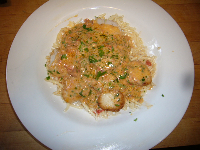 Place scallops on a plate (or on some pasta) and spoon hot sauce over top.
