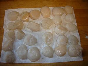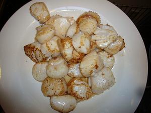 Melt the butter in a heavy pan at med high heat. Saute the scallops, turning only once browned on the bottom. Do NOT overcook! Remove to a plate when done.