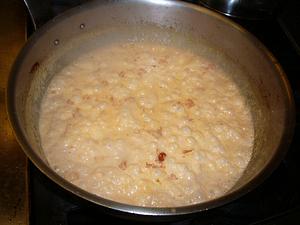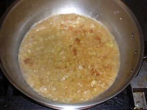 Add minced shallots to the pan and saute till tender, scraping up the brown bits left behind by the scallops. Deglaze the pan with the white wine.