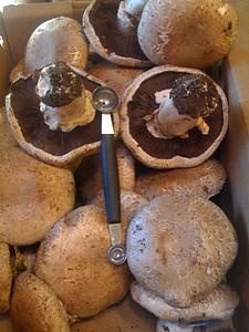 Toss the portobellos and the crimini mushrooms with olive oil. They will absorb quite a bit. Place in a roasting pan.