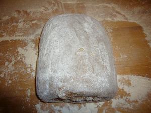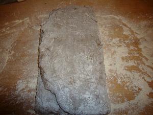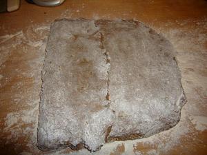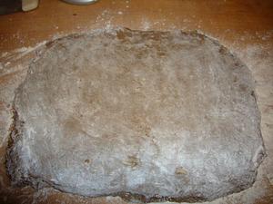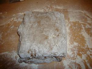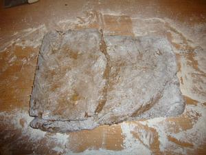 Pat the dough out into a square, moving the dough to keep bottom floured and not sticking to the work table. Brush excess flour off of dough.