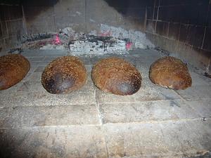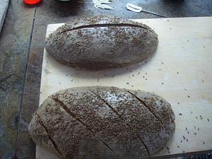 Slash loaves and paint with liquid of choice (I use 1 T of corn starch added to 3/4 cup of cold water, mixed, and brought to a boil while mixing.) Sprinkle with caraway seeds.
