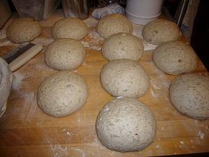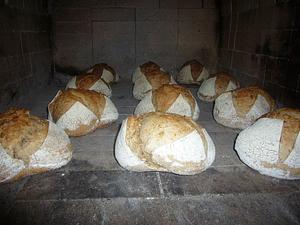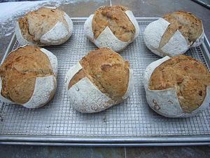 Turn doughs out of banneton and onto a peel. Brush off excess flour. Bake in a temperature stabilized WFO at about 450F for about 45 minutes or till done and a tap on the bottom sounds hollow.