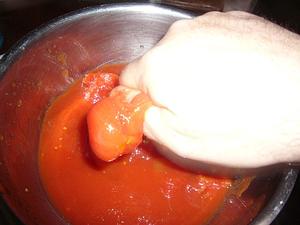 Open the tomatoes and dump into a work bowl. Squeeze the tomatoes to partially crush them.
