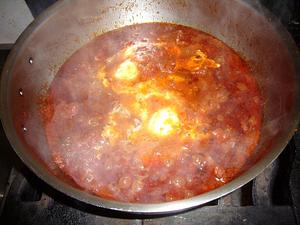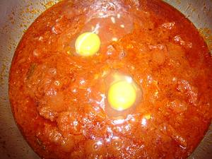 Crack the eggs into the sauce, cover, and allow to cook for about 5 minutes or until yolks are desired doneness.