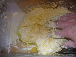 Just before poolish is about to collapse, pour it into a dough box and add additional flours and yeast. Do NOT add the salt or oil yet. Mix till all the flour is wet.