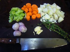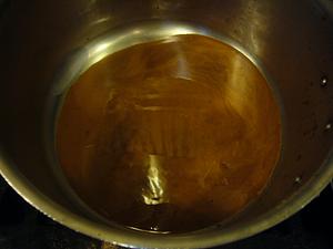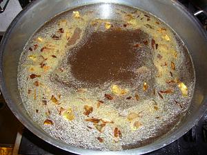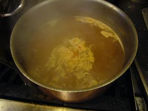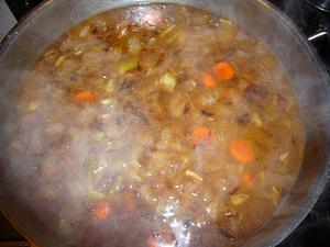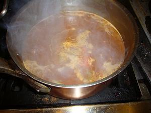 Add the roux mixture to the remaining simmering stock together with the herbs. Be sure to clean out the pot. Simmer for about 2 hours or until reduced by a third. Strain and chill.