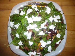 Toss greens with the dressing. Arrange on a platter (or individual dishes) and place small chunks of the cheese around the salad. Serve.