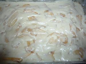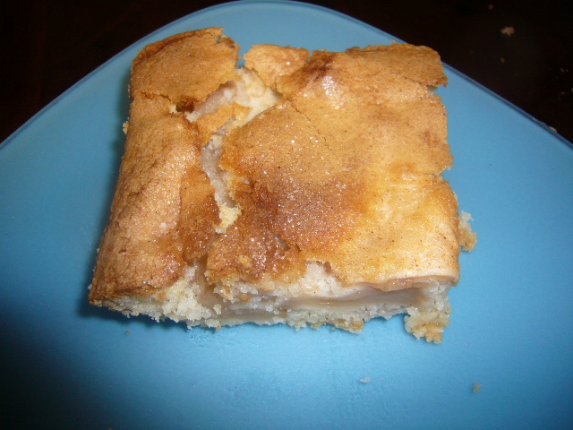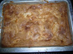 Grease and flour a rectangular cake pan. Add about 1/3 of the batter and spread it out. Place apples on top of the batter.
