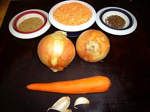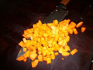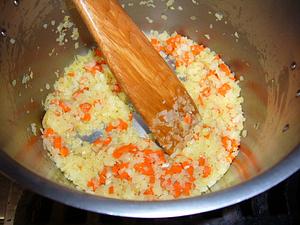 Add some oil to a 5qt saucepan. Heat to medium and add onions and carrot. Saute till soft, around 10 minutes.