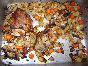 Deglaze roasting pan with some red wine. Add deglaze liquid to the veggies and bones.