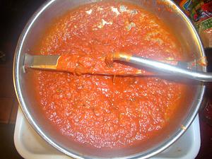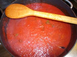 Put the tomatoes in a large pot. Rinse the cans into one of the cans with hot water. Add the sugar and salt to the hot water and stir to disolve. Add to the sauce. Add the bones deglazed veggies, and remaining ingredients and simmer for hours.