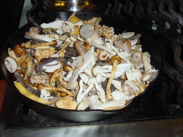 slice mixed versions of mushrooms into 1/4 inch slices. Saute with garlic and shallotts over med. high heat in a good bit of butter. When shrooms start to brown, add some salt. When garlic starts to brown add a half cup of chicken broth. Cook till sauce is almost gone.