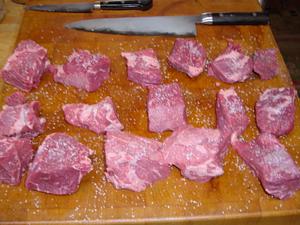 Cut the meat into 2 inch cubes. Season with salt and pepper.