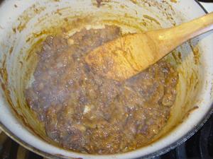 Add some more oil to the pan, and then the onions. Add the salt and tomato paste to the onions. Stir till the onions become limp. Reduce the heat and caramelize the onions.