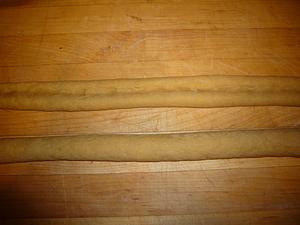 Divide dough into workable pieces, and roll out into a rope about 3/4 inch thick. Push down in the middle of the rope to make a valley.