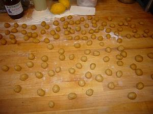 Pinch the dough closed over the nuts and roll some more to tighten the rope. Cut into 3/4 inch pieces.