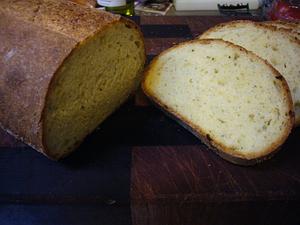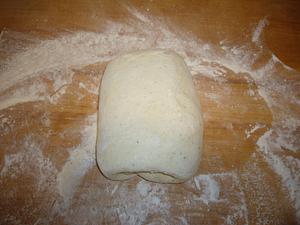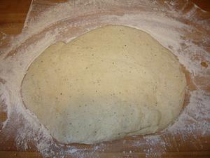 Allow the dough to rise for about an hour and a half. At this point, if you want to serve the bread later, you can put it in a plastic bag and refrigerate (that's what I did today. Dough was in the fridge for about 5 hours. The delay improves flavor, btw.) Shape the dough as you please. I got lazy and didn't take many pictures, and this one looks pretty sloppy, but it isn't an exact science. You could also make a boule or rolls.