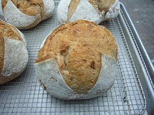 Turn doughs out of banneton and onto a peel. Brush off excess flour. Bake in a temperature stabilized WFO at about 450F for about 45 minutes or till done and a tap on the bottom sounds hollow.